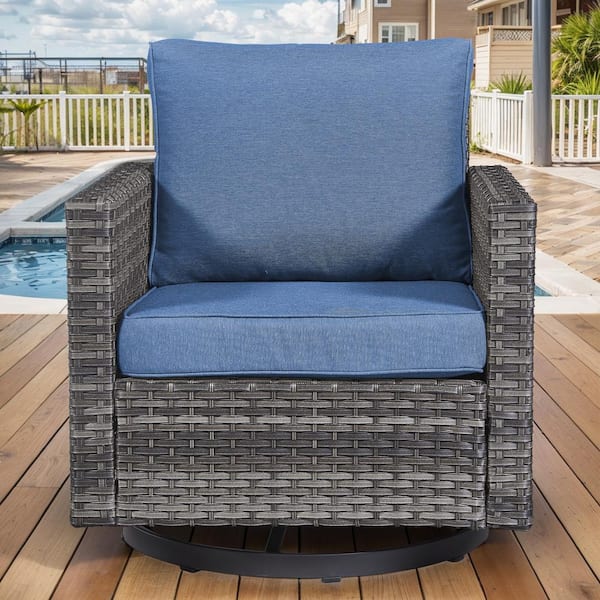 Gray Wicker Outdoor Rocking Chair, Patio Swivel Glider Chair with Navy Blue Cushions for Porch or Balcony (1-Pack)