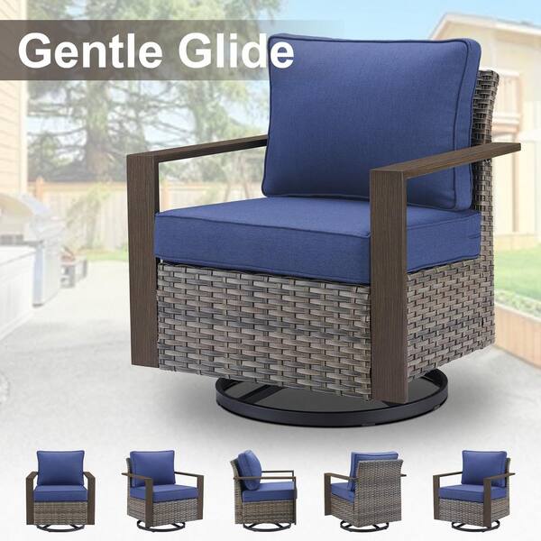 Gray Wicker Outdoor Rocking Chairs, Swivel Patio Chairs with Wood-Looking Metal Arms with Blue Cushions (2-Pack)