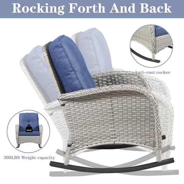 Light Beige 6-Piece Wicker Outdoor Rocking Chairs Patio Conversation Set with Navy Blue Cushions and Side Tables