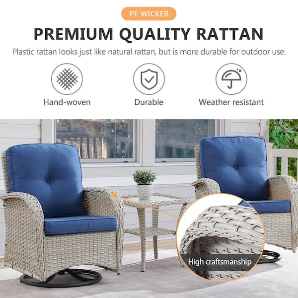 Light Beige 6-Piece Wicker Outdoor Swivel Rockers Patio Conversation Set with Navy Blue Cushions and Side Tables