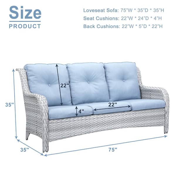 Light Beige Wicker Outdoor Couch, 3-Seat Patio Sofa with Deep Seating and Baby Blue Cushions for Porch Deck Balcony