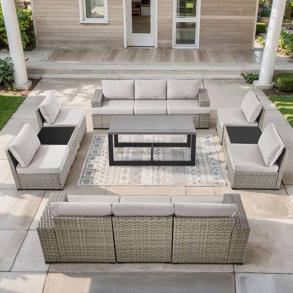 ModNest Taupe 13-Piece Wicker Patio Conversation Set, Modular Sofa Set with Beige Cushions and Coffee Table