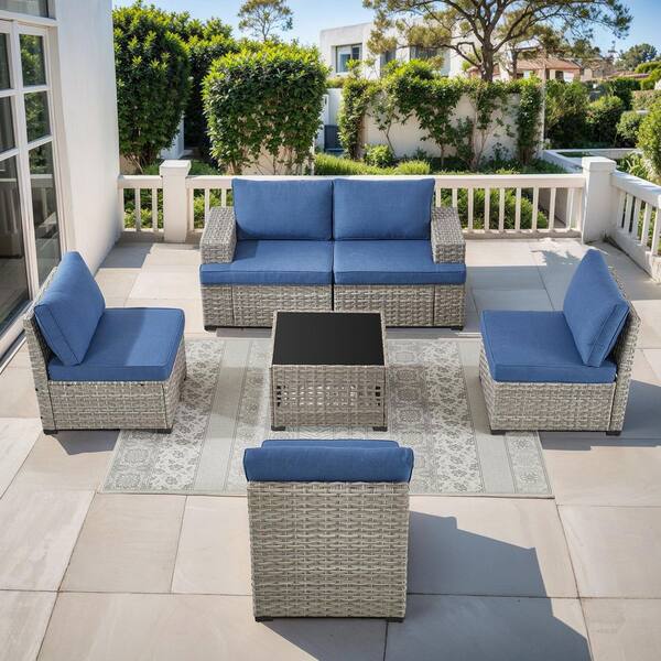 ModNest Taupe 6-Piece Wicker Patio Conversation Set, Modular Sofa Set with Navy Blue Cushions and Coffee Table