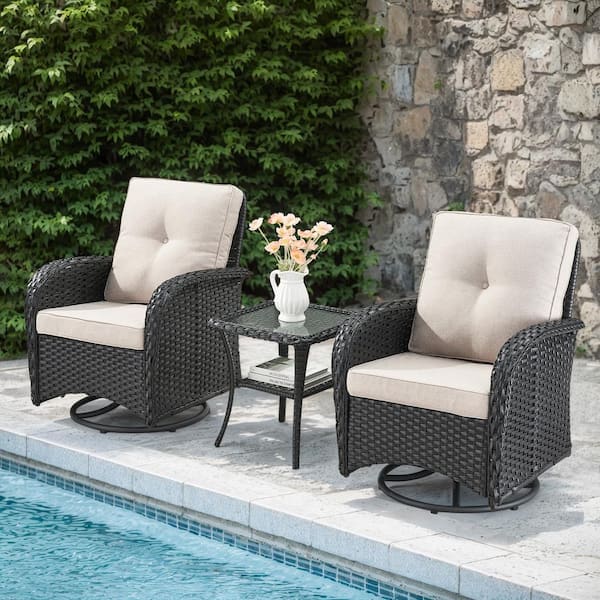PlainCurve 3-Piece Black Wicker Swivel Outdoor Rocking Chairs Patio Conversation Set with Olefin Beige Cushions