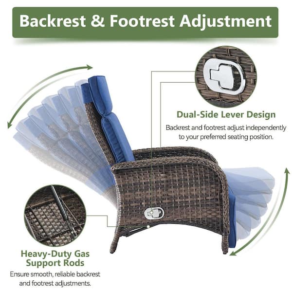 PlainCurve 3-Piece Brown Wicker Outdoor Recliner Chairs Patio Conversation Set with Olefin Blue Cushions and Side Table