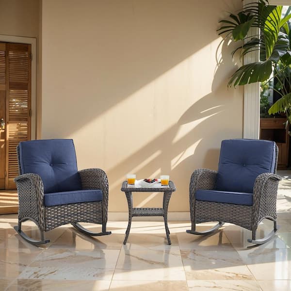 PlainCurve 3-Piece Brown Wicker Outdoor Rocking Chairs Patio Conversation Set with Olefin Blue Cushions