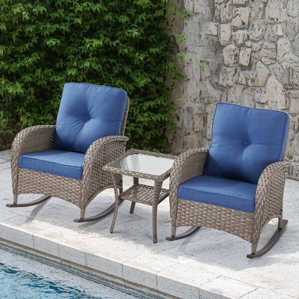 PlainCurve 3-Piece Gray Wicker Outdoor Rocking Chairs Patio Conversation Set with Olefin Blue Cushions