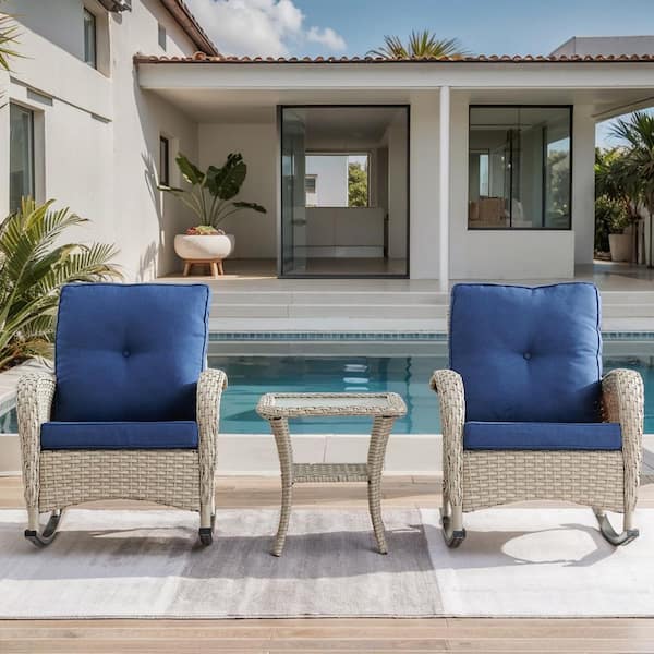 PlainCurve 3-Piece Light Beige Wicker Outdoor Rocking Chairs Patio Conversation Set with Olefin Blue Cushions