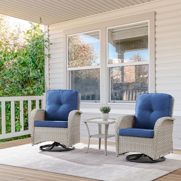 PlainCurve 3-Piece Light Beige Wicker Swivel Outdoor Rocking Chairs Patio Conversation Set with Olefin Blue Cushions