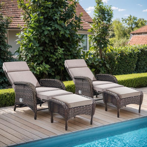 PlainCurve 4-Piece Brown Wicker Outdoor Recliner Chairs Patio Conversation Set with Olefin Beige Cushions and Ottomans