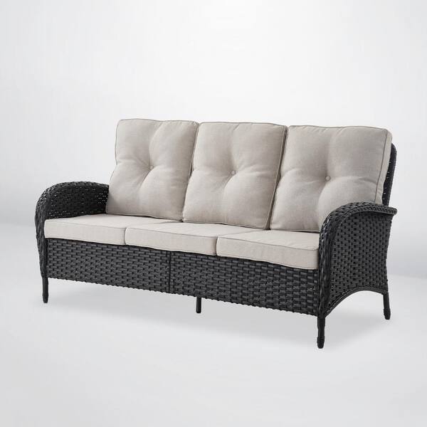 PlainCurve Metal and Black Wicker Outdoor 3-Seat Sectional Couch Patio Sofa with Olefin Beige Cushions