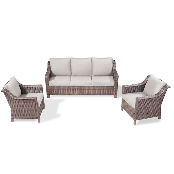 SlideArm Brown 3-Piece Wicker Armchairs Patio Conversation Set, Outdoor Sofa Seating Set with Olefin Beige Cushions
