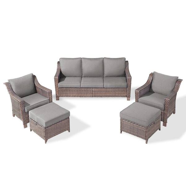SlideArm Brown 5-Piece Wicker Armchairs Patio Conversation Set, Outdoor Sofa Seating Set with Olefin Gray Cushions