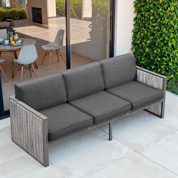 SquareChic Metal and Light Beige Wicker Outdoor 3-Seat Sectional Couch Sofa with Olefin Dark Gray Cushions