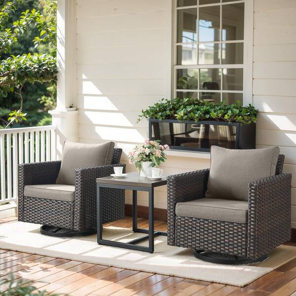 U-Weave 3-Piece Brown Wicker Swivel Outdoor Rocking Chairs Patio Conversation Set with Olefin Gray Cushions