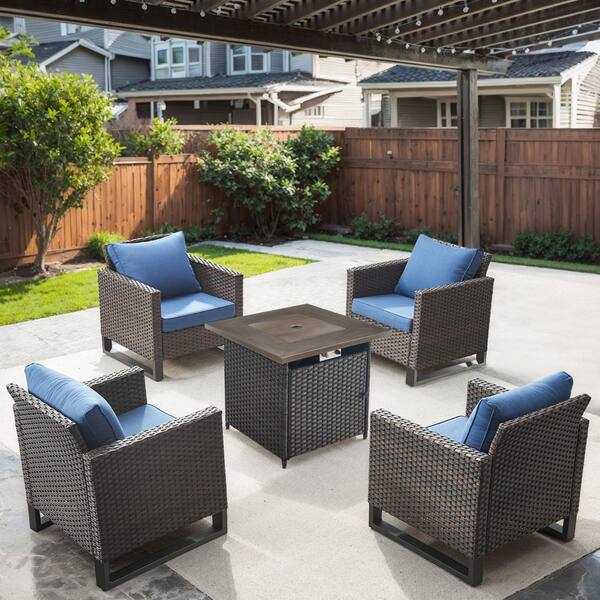 U-Weave 5-Piece Brown Wicker Outdoor Square Fire Pit Conversation Set with Navy Blue Cushions and Armchairs