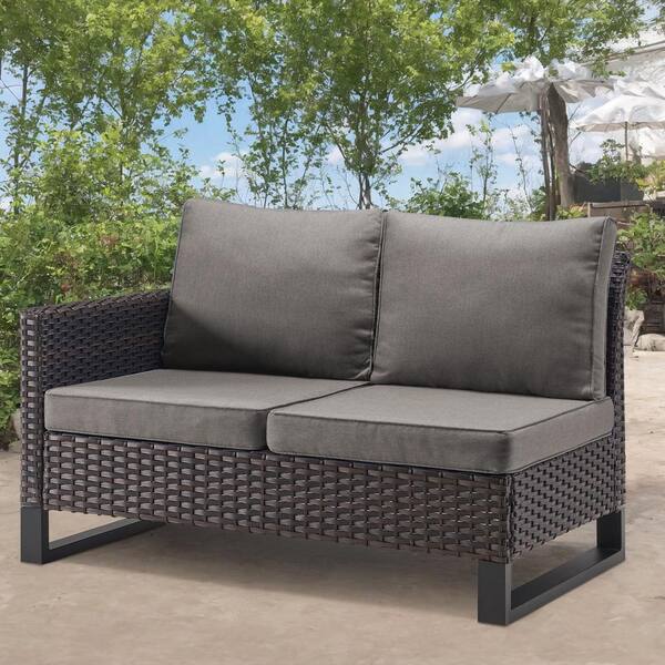 U-Weave Brown Wicker Right Arm 2-Seat Outdoor Sectional Sofa Patio Loveseat with Gray Cushion