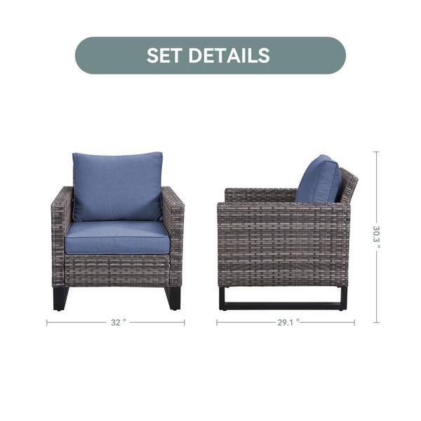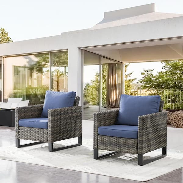 U-Weave Metal and Gray Wicker Outdoor Lounge Chair with Olefin Navy Blue Cushions (2-Pack)