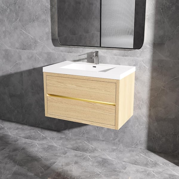 36 in. Wall-Mounted Floating Bath Vanity in Natural Oak with Single Solid Surface Sink Top in White