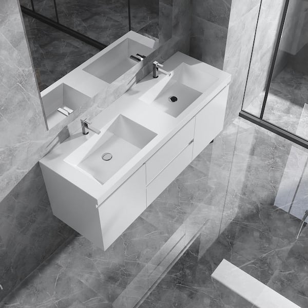 60 in. W x 20 in. D x 22 in. H Floating Bathroom Vanity in Gloss White with Double Solid Surface Sink Top in White