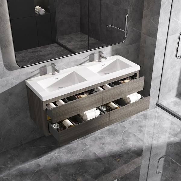 60 in. Wall-Mounted Floating Bath Vanity in Ash Grey with Double Solid Surface Sink Top in White