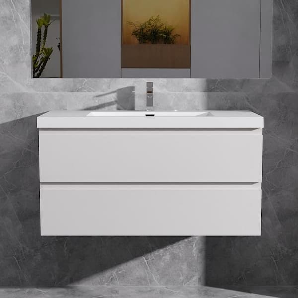 Alice 42 in. W x 20 in. D x 22 in. H Single Floating Bathroom Vanity in Gloss White with Solid Surface Sink Top in White
