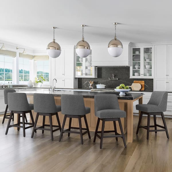 26" Wood 360 Free Swivel Upholstered Bar Stool with Back, Performance Fabric in Charcoal Gray Set of 6