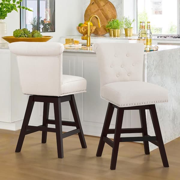 26 in. Beige Linen Swivel Upholstered Barstool Solid Wood Counter Stool Nail Head Trim and Tufted Backrest Set of 2
