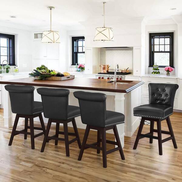 26 in. Black Faux Leather Swivel Barstool Solid Wood Counter Stool with Nail Head Trim and Tufted Backrest (Set of 4)