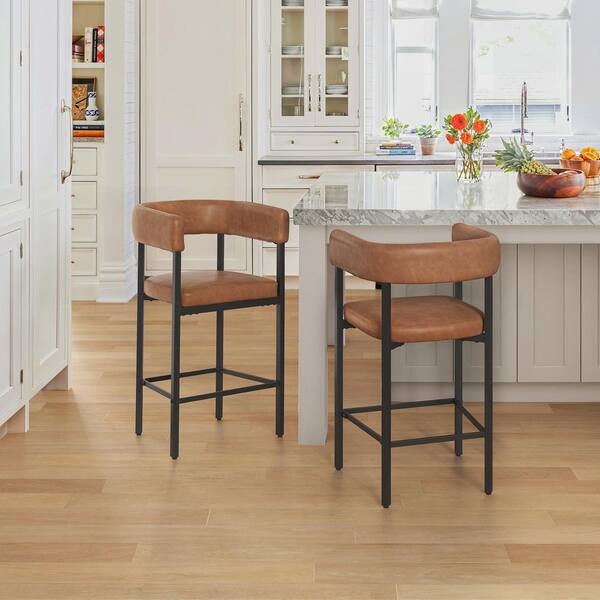 26 in. Brown Faux Leather Metal Frame Bar Chair Wraparound Upholstered Counter Height Bar Stools (Set of 2)