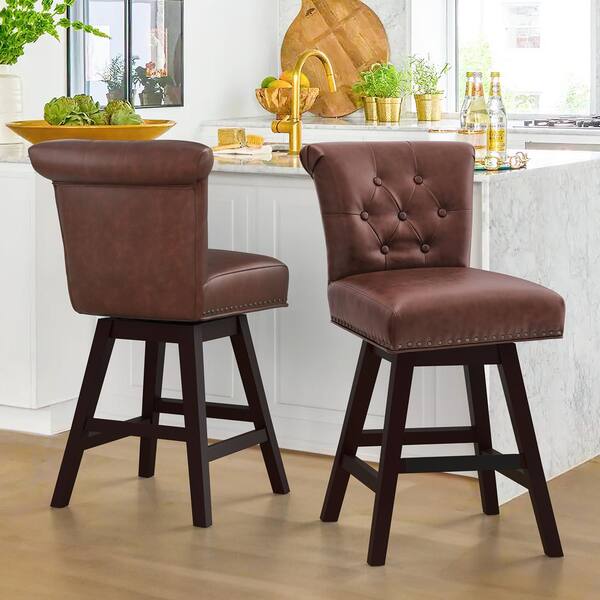 26 in. Brown Faux Leather Swivel Barstool Solid Wood Counter Stool with Nail head Trim and Tufted Backrest Set of 2