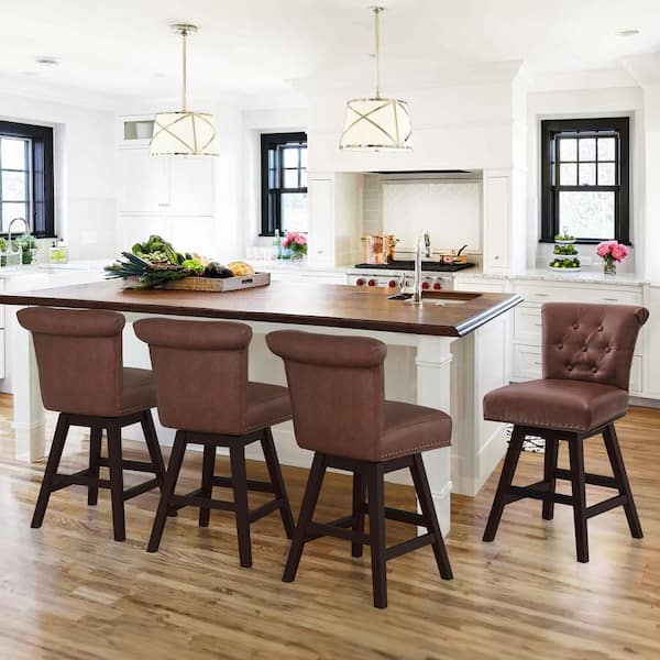 26 in. Brown Faux Leather Swivel Barstool Solid Wood Counter Stool with Nail head Trim and Tufted Backrest Set of 4