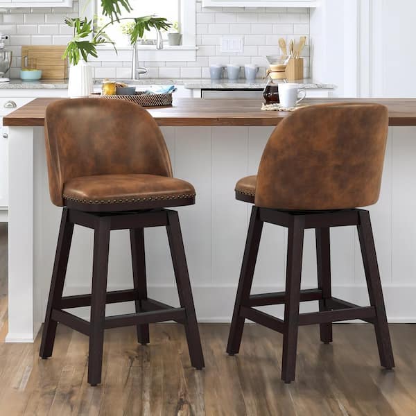 26 in. Brown Wood Frame Swivel Cushioned Bar Stool with Faux Leather, Swivel Counter Stool (Set of 2)