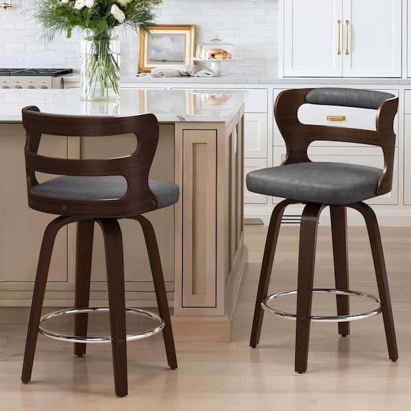 26 in. Gray Faux Leather and Deep Walnut Wood Mid-Century Modern Swivel Counter Height Bar Stool (Set of 2)