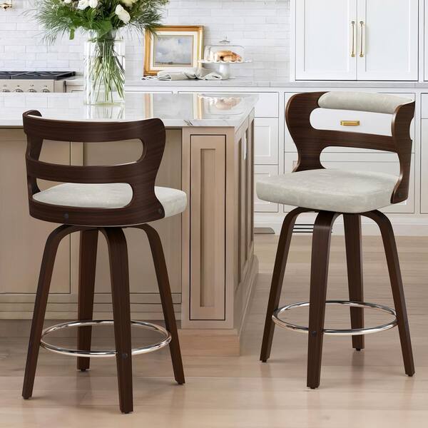 26 in. Light Beige Gray Faux Leather and Deep Walnut Wood Mid-Century Modern Swivel Counter Height Bar Stool (Set of 2)
