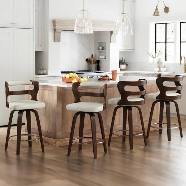 26 in. Light Beige Gray Faux Leather and Deep Walnut Wood Mid-Century Modern Swivel Counter Height Bar Stool (Set of 4)