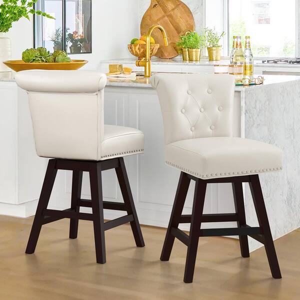 26 in. White Faux Leather Swivel Barstool Solid Wood Counter Stool with Nail Head Trim and Tufted Backrest (Set of 2)