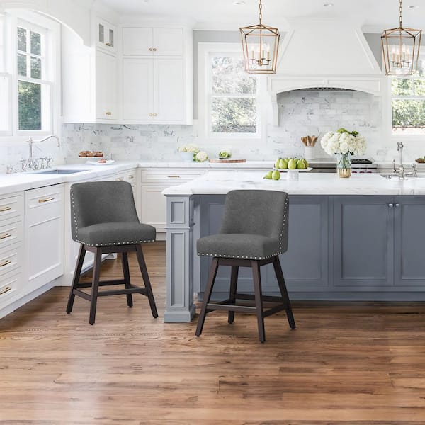26 in. Wood 360° Free Swivel Upholstered Bar Stool with Back, Performance Fabric in Charcoal Gray (Set of 2)