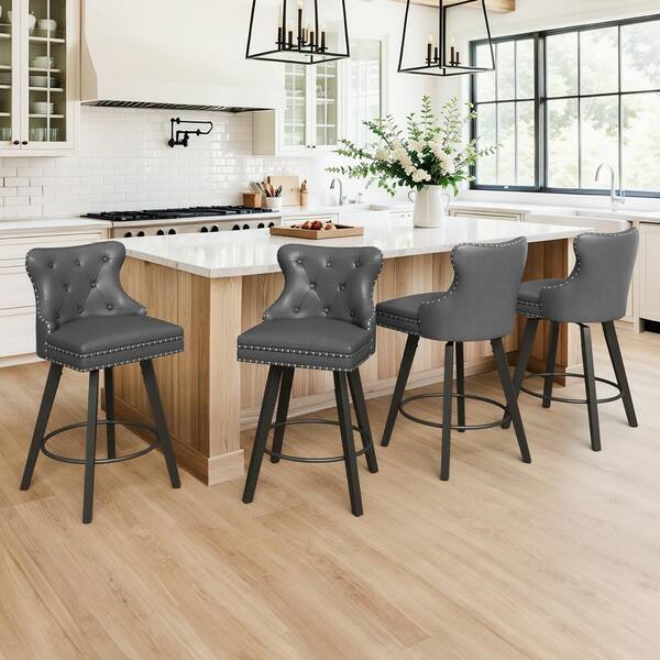 27 in. Counter Stool Dark Gray Faux Leather Upholstered Button Tufted Swivel Bar Stool with Wood Frame Set of 4