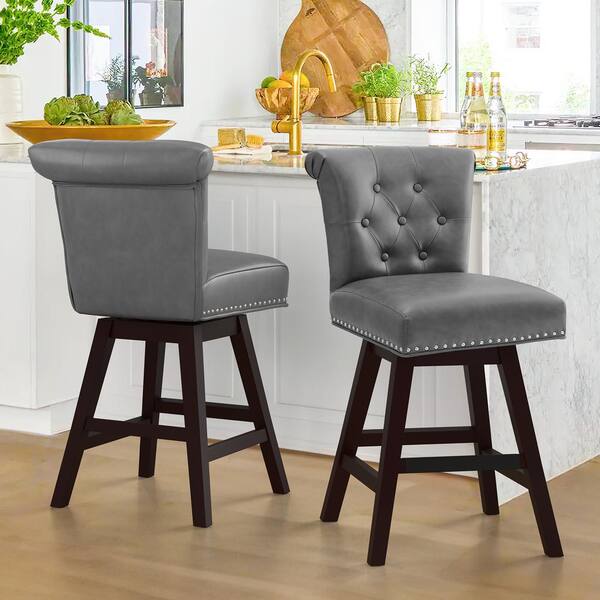 360° Dark Grey Faux Leather Swivel Upholstered Barstool with Tufted Backrest Counter Height Barstool with Nailhead Trim