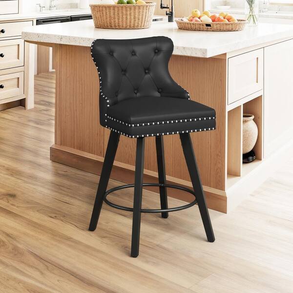 Apollo 27 in. Counter Stool Black Faux Leather Upholstered Button Tufted Swivel Bar Stool with Solid Wood Frame