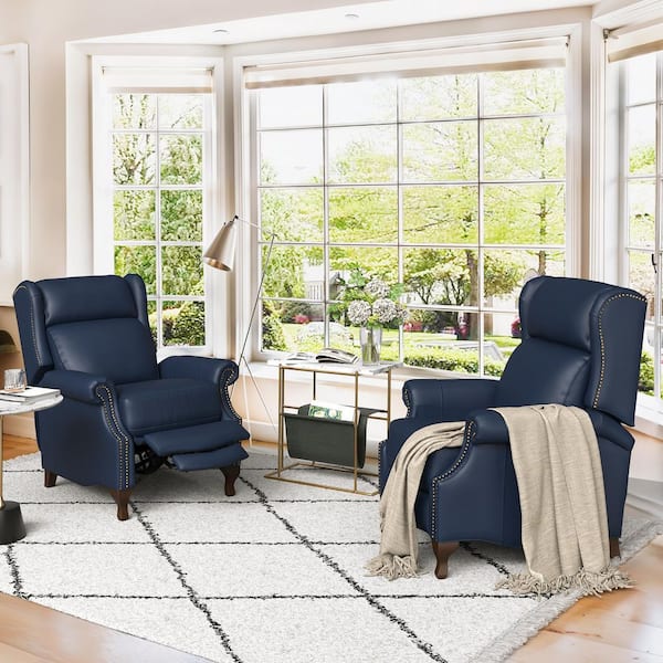 Baldridge 35 in. Navy Genuine Leather Recliner with Adjustable Push Back Footrest and Nailhead Trim(Set of 2)