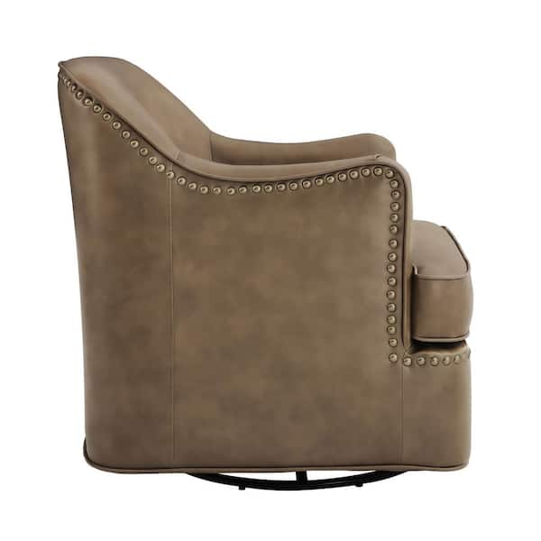 Fazio Grayish Brown Genuine Leather Curved Back Swivel Accent Arm Chair with Nailhead Trims and Metal Base