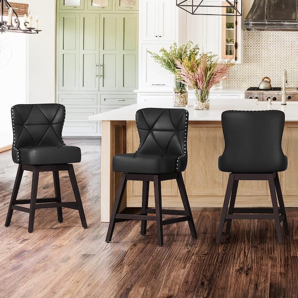Hampton 26 in. Black Solid Wood Frame Counter Stool with Back Faux Leather Upholstered Swivel Bar Stool Set of 4