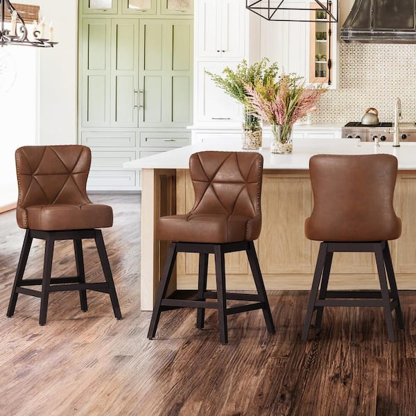 Hampton 26 in. Dark Brown Solid Wood Frame Counter Stool with Back Faux Leather Upholstered Swivel Bar Stool Set of 4