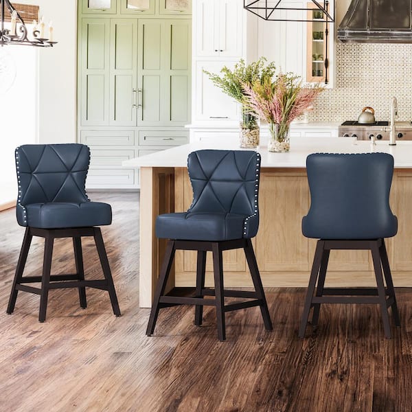 Hampton 26 in. Navy Blue Solid Wood Frame Counter Stool with Back Faux Leather Upholstered Swivel Bar Stool Set of 4