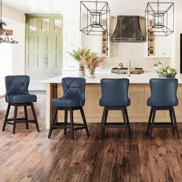 Hampton 26 in. Navy Blue Solid Wood Frame Counter Stool with Back Faux Leather Upholstered Swivel Bar Stool Set of 6