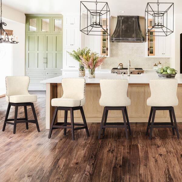 Hampton 26 in. Off-White Solid Wood Frame Counter Stool with Back Linen Fabric Upholstered Swivel Bar Stool Set of 6