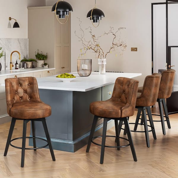 Rowland 26.5 in Seat Height Brown Faux Leather Counter Height Solid Wood Leg Swivel Bar stool(Set of 1)