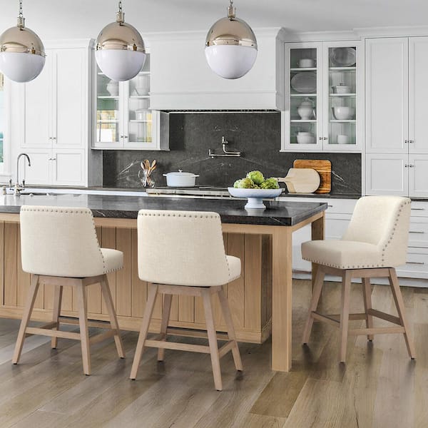 Zoi 26 in. Wood 360 Free Swivel Upholstered Bar Stool with Back, Performance Fabric in Beige. (Set of 3)